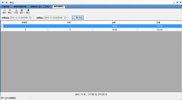 点击“现场管理”的“按设备号统计”,在弹出的窗体里选择要统计的时间段后,点击“统计”按钮即可,如下图: