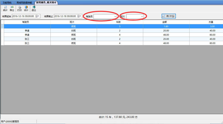 点击“现场管理”的“按驾驶员、班次统计”,在弹出的窗体里选择要统计的时间段后,点击“统计”按钮即可,如下图: