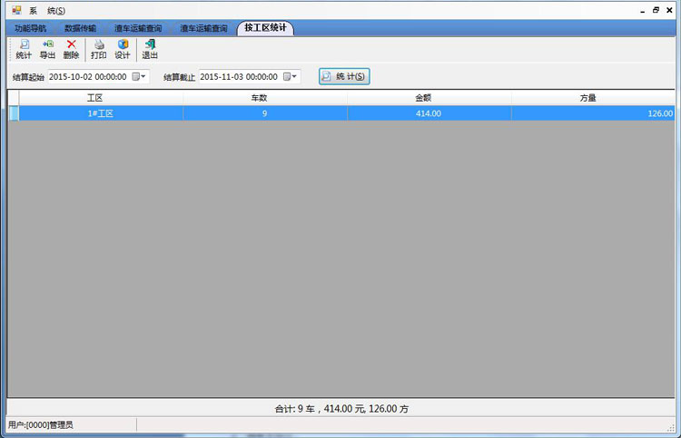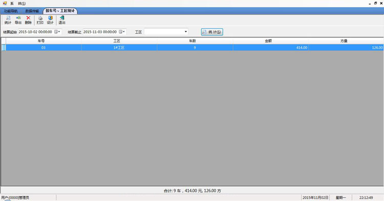 点击“现场管理”的“按车号、工区统计”,在弹出的窗体里选择要统计的时间段后,点击“统计”按钮即可,如下图: