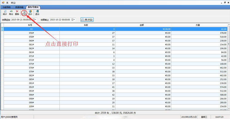 点击“现场管理”的“按终端好、车号统计”,在弹出的窗体里选择要统计的时间段后,点击“统计”按钮即可,如下图: